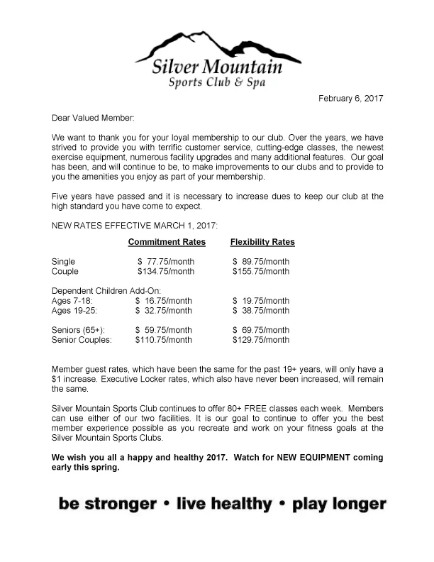 New Rate Letter Silver Mountain Sports Club Spa